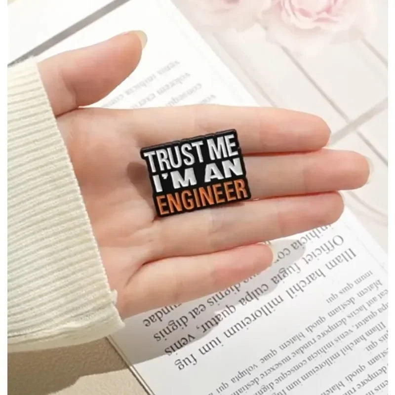 This fun brooch features the humorous phrase "TRUST ME I'M AN ENGINEER" in bold English letters. The creative design makes it perfect for engineers, students, or anyone who appreciates witty, profession-themed accessories.