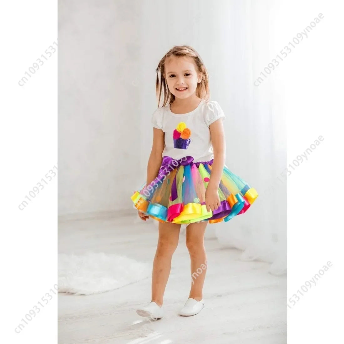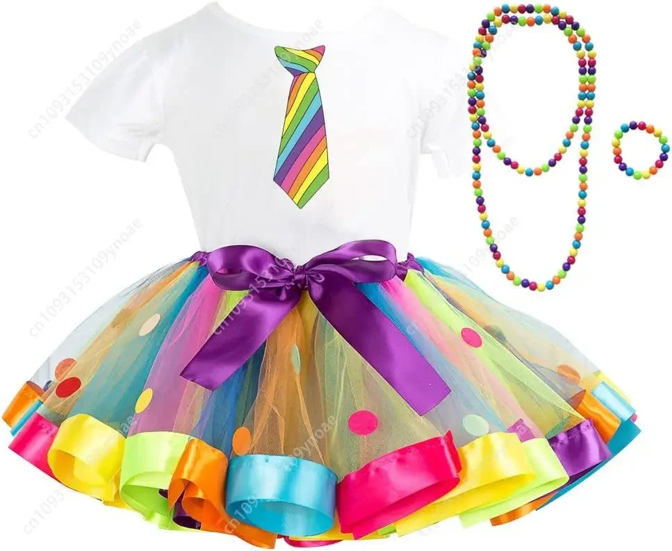 This charming 2-piece outfit features a fluffy rainbow polka dot tutu skirt paired with a cotton short sleeve top, complete with matching necklace and bracelet accessories. Perfect for dress-up, dance, parties, or everyday magical moments.