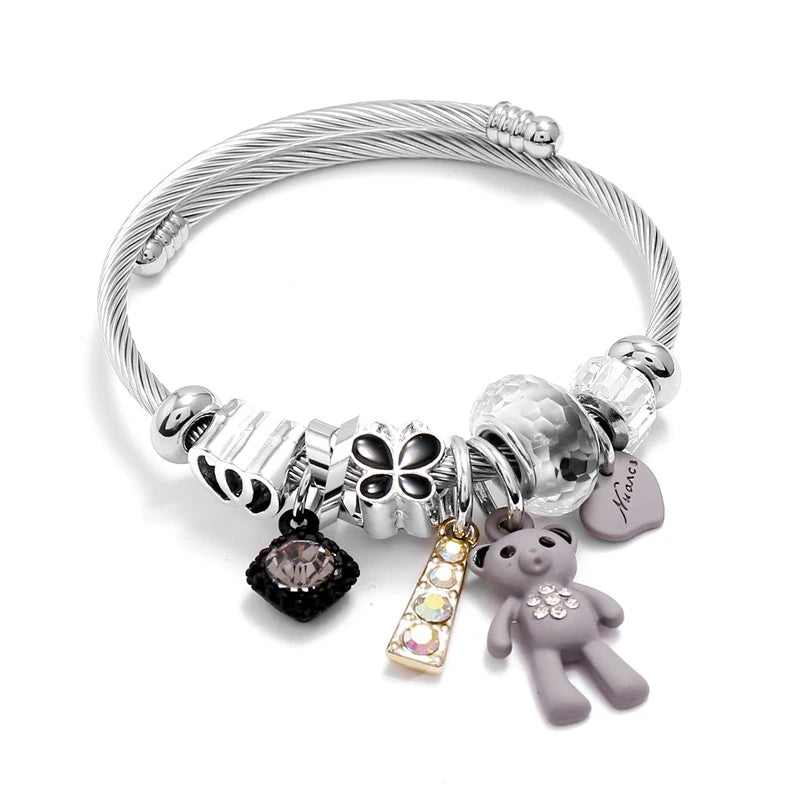 This charming stainless steel bracelet features an adorable big pink bear pendant accented with hearts and love motifs. The playful yet elegant design adds a touch of whimsy to your jewelry collection while maintaining a sophisticated aesthetic.