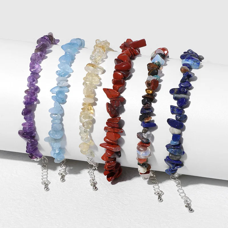 This stunning bracelet features genuine natural quartz crystals in irregular bead chip form, showcasing the unique beauty of amethyst, aquamarine, and citrine stones. Each piece is one-of-a-kind, with natural variations that make your bracelet truly special.